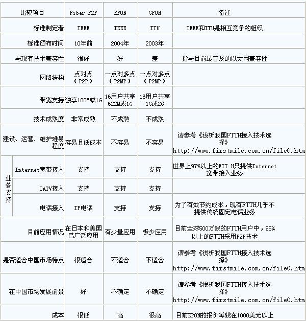 網絡技術是從1990年代中期發展起來的新技術,它把互聯網上分散的資源融為有機整體,實現資源的全面共享和有機協作,使人們能夠透明地使用資源的整體能力并按需獲取信息。資源包括高性能計算機、存儲資源、數據資源、信息資源、知識資源、專家資源、大型數據庫、網絡、傳感器等。 當前的互聯網只限于信息共享,網絡則被認為是互聯網發展的第三階段。 作為國內首家專業從事光纖到戶(Fiber To The Home——FTTH)設備研發生產的企業,最近我們接到許多FTTH應用需求,在與FTTH不同類型用戶溝通過程中,我們發現不少用戶對FTTH技術選擇和應用普遍存在認識誤區。這些認識誤區包括:忽視FTTH技術風險,盲目要求支持全業務接入;不了解我國FTTH市場特點,盲目選擇FTTH接入技術;潛意識認為FTTH網絡建設一定是高投入,缺乏發展眼光分析FTTH投資效益。 誤區一、忽視FTTH技術風險,盲目要求支持全業務接入 很多用戶動軋要求FTTH支持全業務,要求同時支持寬帶上網、有線電視(CATV)接入和傳統固定電話接入,即所為三網合一接入,希望實現FTTH接入技術一步到位。我們認為,能支持寬帶上網、有限電視(CATV)接入和普通固定電話接入固然理想,但這實際上存在巨大技術風險。 FTTH技術是打破最后一公里通信瓶頸的新技術,目前主要有三種FTTH技術標準:基于以太網的點對點(Ethernet Fiber P2P)技術、基于以太網的無源光網絡(Ethernet Based Passive Optical Network——EPON)技術和基于通用幀協議的無源光網絡(General Frame Protocol Based Passive Optical Network——GPON)技術。三種FTTH接入技術特點比較如下:
