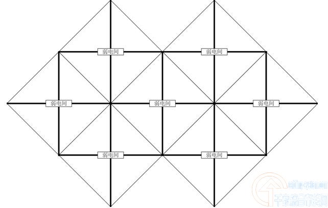 實際上,電信間之間采用等邊三角形方式布局,也許效果會更好,但用于工程橋架的設計很少會采用斜線方式,所以45度的直角三角形布局方式就成為了比較理想的工程選擇方案。