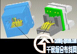 異形針結構設計在水晶頭插入后,其接觸點不在同一個平面上,并由此八個接觸點彼此間的距離更遠,使六類系統鏈路能獲得更好的近端串音(NEXT)。 除此之外,異形針結構還加強了金針與水晶頭等金片的可靠接觸,并有效地增加其彼此的接觸面。 特點三:垂直進線方式及IDC分線結構設計