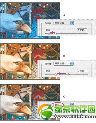 ![]() 校正白平衡 A. 向右移動 “色溫”滑塊可校正光線色溫較高時拍攝的照片 B. 向左移動“色溫”滑塊可校正光線色溫較低時拍攝的照片 C. 調(diào)整色溫后照片的最終效果
