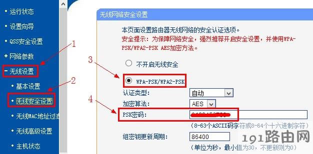 3、設(shè)置Wi-Fi密碼和加密方式:TP-Link路由器的管理界面點擊“無線設(shè)置”---->“無線安全設(shè)置”---->點擊右側(cè)界面的“WPA-PSK/WPA2-PSK”加密方式(這種加密方式最安全)---->在下面的“PSK密碼”后面輸入Wi-Fi的密碼---->點擊“保存”