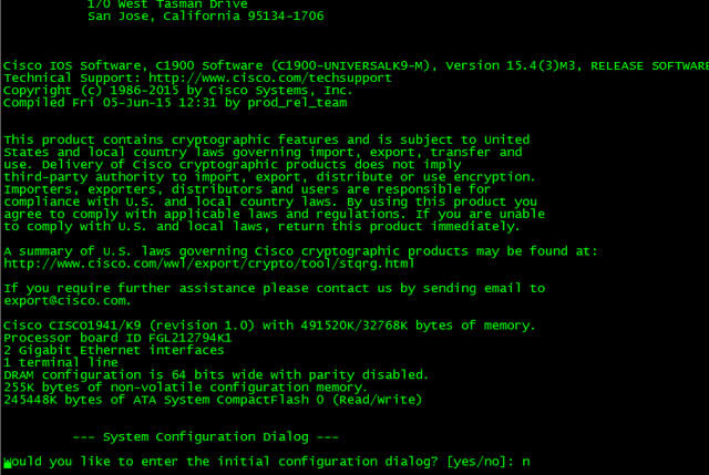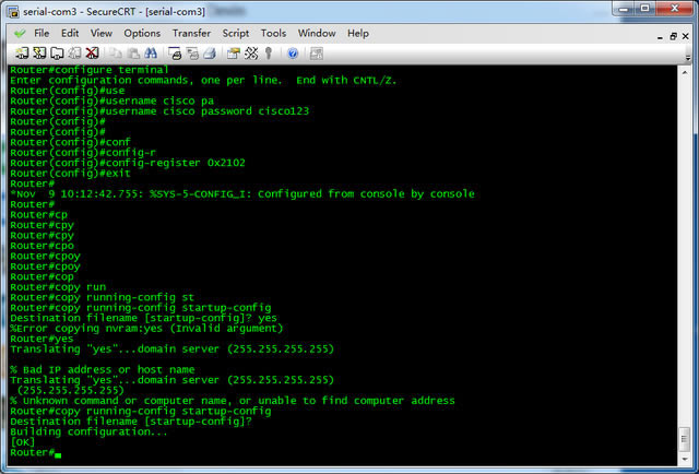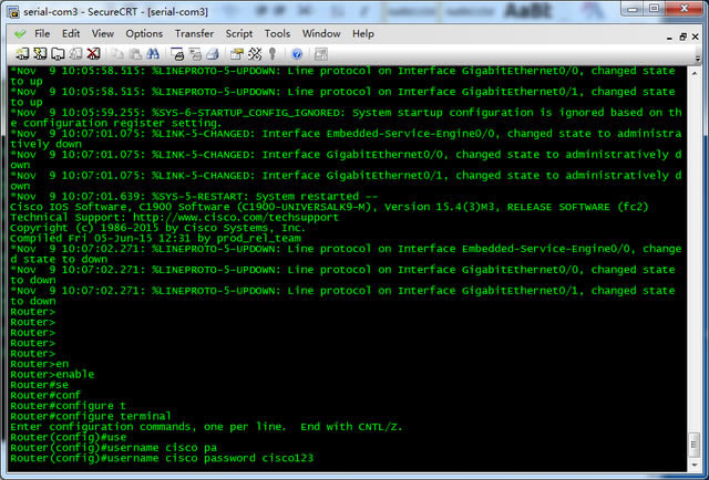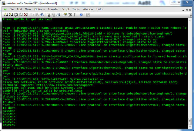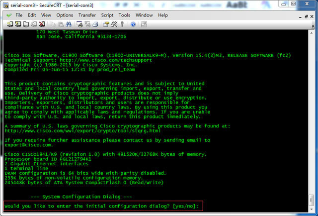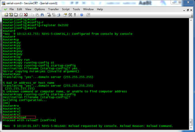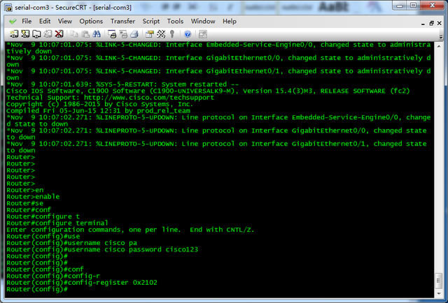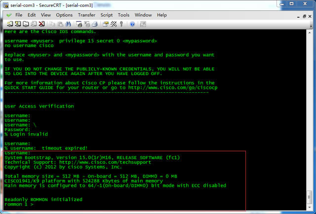 Cisco 1941破解密碼 將鍵盤連接到筆記本電腦,因為沒有筆記本電腦Break鍵,所以要把USB鍵盤連接筆記本,打開SecureCRT連接路由器。 如下圖所示: ![]() (注意這里的鍵盤是連接筆記本,而不是連接1900路由器后面USB口) 重新啟動路由器,然后啟動,始終按鍵盤Ctrl Break鍵,直接看到進入ROMMON1 ![]() 進入ROMMON1之后更換寄存器的值 Confreg 0x2142 0x2142直接跳過配置文件,直接進入路由器。 ![]() 配置完成后,路由器將重新啟動,然后路由器將自動加載初始配置 ![]() 這里都選擇no ![]() 然后可以通過一系列的啟動順利進行Router>界面 ![]() 不輸入密碼即可進入enable,這里不需要配置usename和password,配置用戶名和密碼時,需要將其掛載line console 0 直到口上才開始。 ![]() 配置完成后,將寄存器值替換為正常可保存的0x2102 ![]()