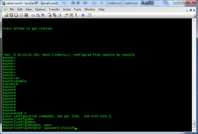 配置完成后,保存啟動路由器。 ![]() 可以調協enable password cisco123 進入特權模式時,需要輸入密碼 cisco123 ![]() |