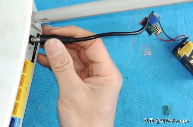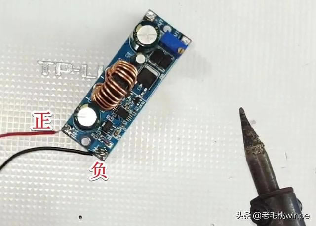 要知道路由器的工作電壓是直流9伏,所以用這么小的升壓模塊很容易達到預期的效果。 具體操作步驟: 1.在升壓模塊板的輸出側上焊接路由器的供電頭,注意區分正負極。