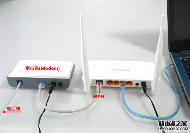 b、(無(wú)ADSL Modem貓)直接將網(wǎng)線連接到路由器WAN口(藍(lán)色),找一條短網(wǎng)線,一端接電腦,一端接路由器 任/2/3/4任1/2/3/4,接線方式如下圖所示: