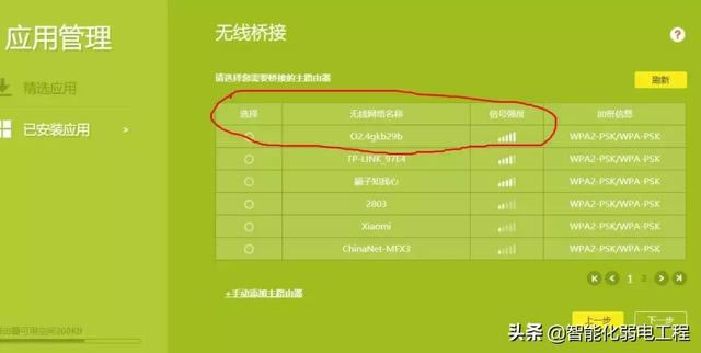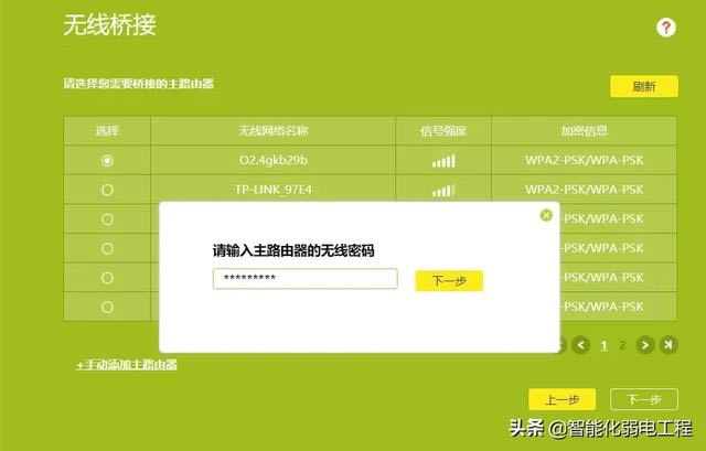 選擇主路由器wifi名稱,然后點(diǎn)擊下一步,輸入主路由器的wifi密碼(所以記住主路由器wifi密碼)。