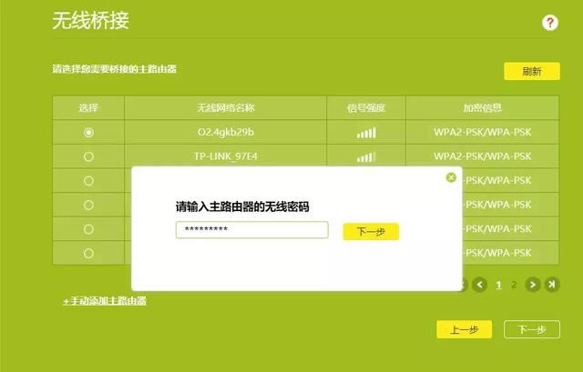 選擇主路由器wifi名稱,然后點擊下一步,輸入主路由器的wifi密碼(所以記住主路由器wifi密碼)。