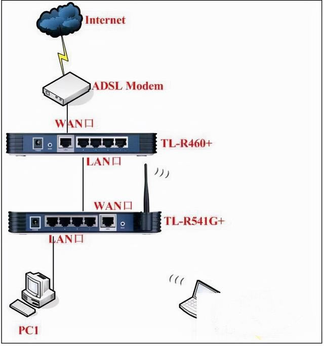 1)寬帶線〈—〉ADSL MODEM〈—〉R460 (LAN口)〈—〉(WAN口)WR541G (無線)〈—〉電腦