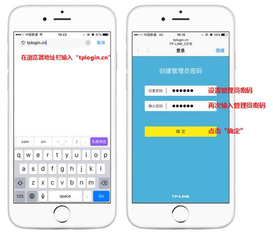 3、連接Wi-Fi之后,手機會自動彈出路由器的設置頁面。如果沒有自動彈出,請打開瀏覽器,輸入地址欄tplogin.cn(部分早期路由器管理地址為192.168.1.1)。路由器登錄密碼設置在彈出窗口中(密碼長度在6-32位間隔),以后管理路由器(登錄界面)時,請妥善保管。如下圖: