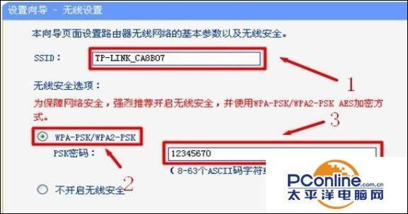 5.無線網絡設置:設置SSID”,SSID是無線網絡的名稱,注意不要用中文——>;選擇“WPA-PSK/WPA2-PSK”——>;設置“PSK密碼”——>;下一步。