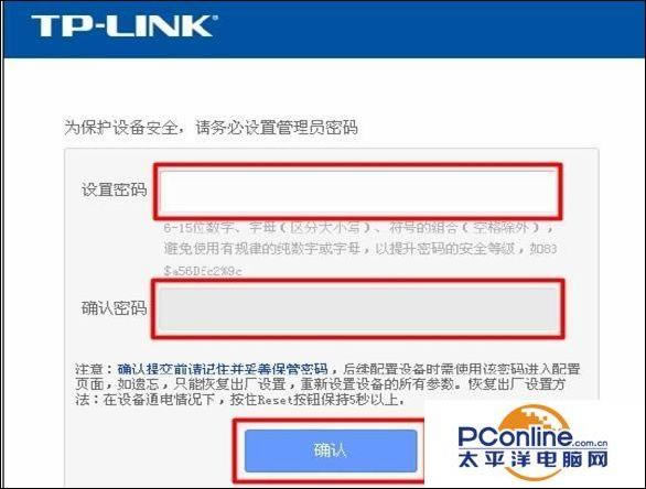 1、登錄管理界面:打開網頁瀏覽器,輸入瀏覽器地址欄:tplogin.cn并按下回車——>;設置管理員登錄密碼——>;點擊確認。(請記住您設置的管理員登錄密碼。一旦忘記登錄密碼,只能通過恢復工廠設置來重新配置)