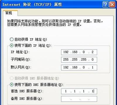 3.單擊彈出框中的自動獲取IP自動獲取地址DNS服務器地址分別修改為使用以下服務器地址IP使用以下地址和使用以下地址DNS服務器地址,并在IP輸入地址欄1922.168.0.在子網掩碼欄中輸入255.255.255.在默認網關中加入192.168.0.1”,在首選DNS服務器地址欄輸入1.1.1.1”,最后點擊確定保存設置;