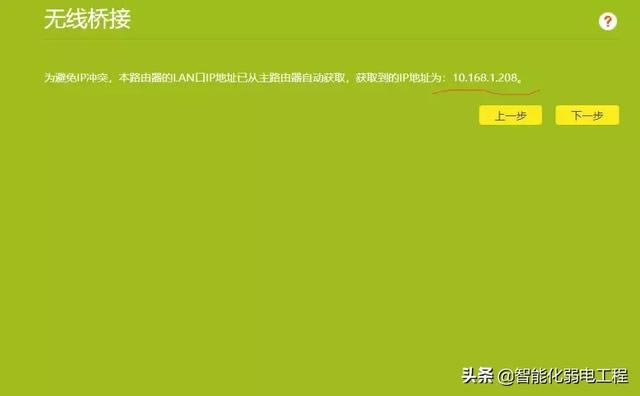 橋接的整個(gè)過(guò)程設(shè)置也很簡(jiǎn)單。 補(bǔ)充: 在弱電君的補(bǔ)充下,這里可以看到一種現(xiàn)象,即橋接成功后,副路由器的登錄地址發(fā)生了變化, 未橋接前:副路由器的默認(rèn)登錄地址是192.168.1.1, 橋接后:副路由器的登錄地址變?yōu)?0.168.1.208,主路由器ip地址為同一網(wǎng)段。因此,如果以后進(jìn)入副路由器,則需要輸入ip地睛10.168.1.208進(jìn)入了。因此,如果以后進(jìn)入副路由器,則需要輸入ip地睛10.168.1.208進(jìn)入了。