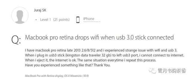 來自谷歌翻譯我在2013年后期的Macbook Pro Retina 2.6 / 8/512上遇到了wifi和USB 3的奇怪問題。當我將USB3棒(Kingston Data Traveler 32 GB)插入左側的USB3端口時,我無法連接到互聯網。當我彈出它時,互聯網就可以了。每次我重復此過程時,情況相同。您是否經歷過類似的事情?謝謝。
