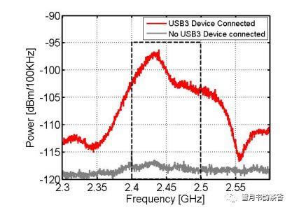 USB3.0在使用時,會在2.4G頻段增加約20dB的噪聲,造成對2.4GHz ISM頻段的射頻干擾。這種干擾會降低無線接收的靈敏度,進而縮減收訊范圍,足以影響干擾無線設備(無線網卡、無線鼠標及無線耳機等)的正常使用。實際上,USB3.0的擴頻處理導致其頻譜從0Hz一直蓋到5GHz。經Intel測量,干擾功率隨頻率下降,在2.4G頻段約有-60dBm,到5G頻段只有-90dBm。同時文中還指出,當這頻段的射頻接收器放得愈靠近USB 3.0裝置或連接器,干擾的狀況就愈明顯