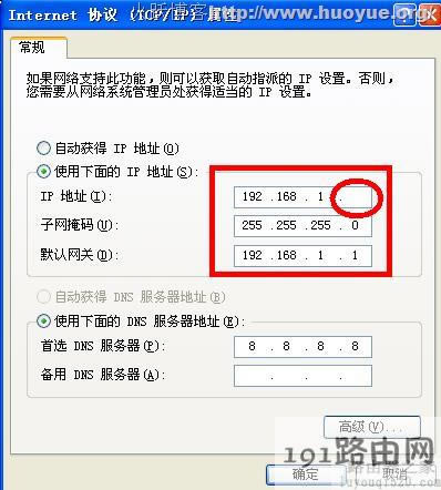 上面那個圈會是你自己設置的參數,在DNS中填寫寬帶服務商給你的DNS,各地都不一樣,在這里我們使用GOOGLE提供的DNS地址,使用這個DNS是通用的,而且還能屏蔽本地的電信廣告。然后點確認就可以上網了!如果還不行可以重啟一下電腦!