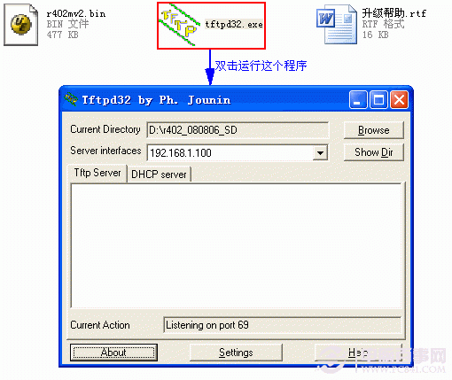 運(yùn)行后直接將Tftpd32.exe程序最小化,千萬不要關(guān)閉(待升級完成以后,才可以關(guān)閉該程序);
