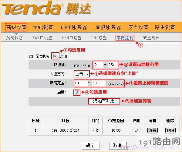 | 路由器(Router)是連接兩個或多個網絡的硬件設備,在網絡間起網關的作用,是讀取每一個數據包中的地址然后決定如何傳送的專用智能性的網絡設備。 原標題:"騰達(Tenda)無線路由器限速設置方法"的相關路由192.168.1.1登錄設置教程。來源 - 本站。 本文解決問題:在騰達(Tenda)無線路由器限制局域網中計算機網速的方法,局域網中某一臺計算機在線觀看視頻、使用迅雷等p2p軟件下載文件時,會大量占用寬帶,其他計算機可能無法正常瀏覽網頁了,因此合理的分配每一臺計算機允許使用的最大帶寬是非常有必要的。 寬帶單位換算對照表![]() 登錄設置界面1.在瀏覽器中輸入:192.168.0.1 按回車鍵,在跳轉的頁面中輸入密碼admin ,確定即可。(如果192.168.0.1打不開,請閱讀文章:騰達(Tenda)無線路由器192.168.0.1打不開的解決辦法) ![]() 2.點擊“高級設置”。 ![]() 設置限速1.點擊“帶寬控制”---->設置“上傳”帶寬范圍(以2M adsl撥號,2個人平均分配網速為例) ![]() 2.設置“下載”帶寬范圍---“確定”。 ![]() 重啟路由器點擊“系統工具”-“重啟路由器”將路由器重啟,重啟完成后,設置的限速策略就生效了。 ![]() 注意:如果想單獨控制一臺電腦的網速,只需要查看到對方的ip地址,并在騰達路由器上進行IP和MAC地址綁定,確保對方一直使用這個Ip地址;然后在“第二步”把ip地址換成這個綁定IP地址,帶寬設置范圍可以參照我們的帶寬對照表設置。 路由器不僅讓你更穩定快速地連接無線網絡,更可以讓家中的智能設備連接在一起。 |