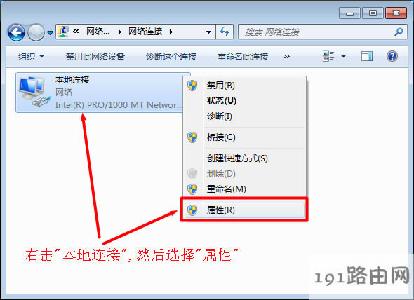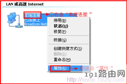 2、鼠標(biāo)右擊“本地連接”—>點(diǎn)擊“屬性”