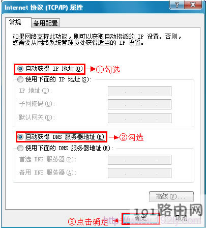 5、勾選“自動(dòng)獲得IP地址”和“自動(dòng)獲得DNS服務(wù)器地址”選項(xiàng)---->點(diǎn)擊“確定”。
