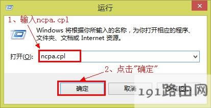 2、在運(yùn)行程序里面輸入ncpa.cpl—>點(diǎn)擊”確定”(或者按鍵盤(pán)上面的回車(chē)鍵)