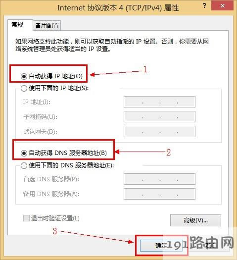 4、選擇“自動(dòng)獲得IP地址”和“自動(dòng)獲得DNS服務(wù)器地址”——>點(diǎn)擊“確定”。