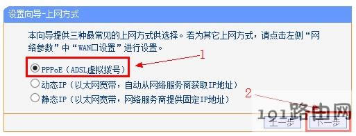 3、選擇“PPPoE(ADSL虛擬撥號(hào))”,然后點(diǎn)擊“下一步”。