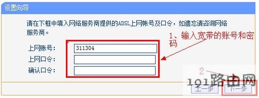 4、輸入“上網(wǎng)賬號(hào)”和“上網(wǎng)口令”(寬帶運(yùn)營(yíng)商提供給你的上網(wǎng)帳號(hào)和密碼),然后點(diǎn)擊“下一步”。