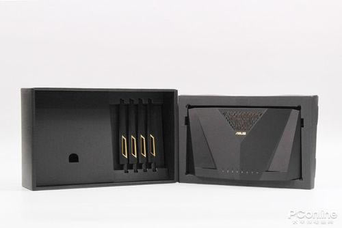 ▲打開包裝盒,拆下路由器上的塑料密封,你可以看到華碩RT-AX88U的本尊了。整體采用黑色啞光配色,讓中間的金色ASUS”LOGO它特別引人注目。四根可拆卸的高性能天線包裝在包裝盒的第二層,底部也用金色鏤空作為畫龍點(diǎn)睛,打破了整體黑色帶來的沉重和沉悶感。