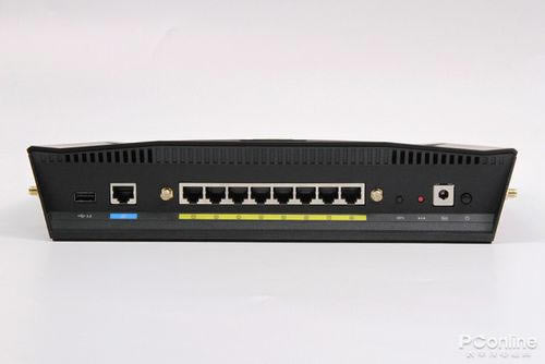 ▲從左到右的機(jī)身后端接口部分USB3.0接口,千兆WAN口,8個(gè)千兆LAN口,WPS按鈕,Reset按鈕、電源插孔、電源按鈕。
