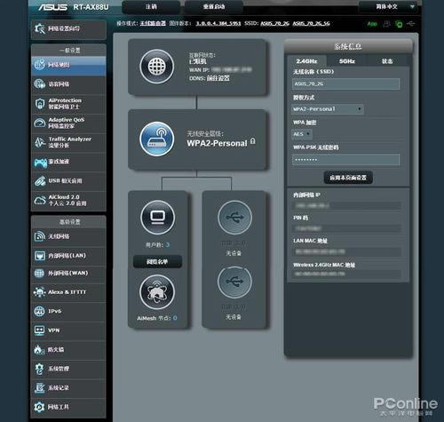 3 UI設(shè)計(jì)與功能簡(jiǎn)介 UI設(shè)計(jì)與特色功能 看完外觀,我們?cè)賮砜纯慈A碩RT-AX88U的UI設(shè)計(jì)和一些功能設(shè)置。如下圖所示,華碩RT-AX88U遵循華碩以往豐富的固件界面風(fēng)格:左上為一般設(shè)置,左下為先進(jìn)設(shè)置。頂部是幾個(gè)快速功能,包括快速打開游戲加速和彈出U盤。中間是路由器狀態(tài)概述,右邊是系統(tǒng)信息。