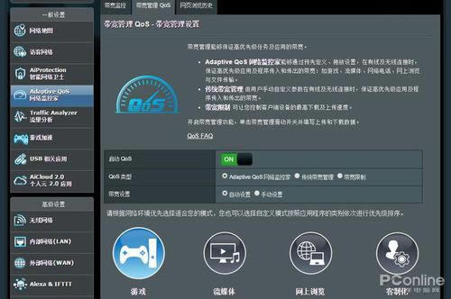 ▲Adaptive QoS網(wǎng)絡(luò)監(jiān)控器可以保證游戲、流媒體、網(wǎng)上瀏覽、文件傳輸?shù)雀邇?yōu)先級(jí)應(yīng)用和程序傳輸?shù)膸挘ㄟ^預(yù)定義和拖放設(shè)置,在有線和無線連接時(shí)進(jìn)行。開啟QoS之后,可以選擇[Adaptive QoS網(wǎng)絡(luò)監(jiān)控器QoS類型,并在下面選擇應(yīng)用模式優(yōu)先級(jí)。