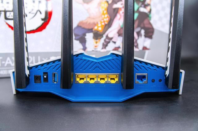 指示燈上方有一個滅字logo,機身表面還有嘴平伊助專屬的雙刀刃紋理。 ![]() 路由器機身側面是豬哥的口頭禪豬突進。 ![]() 產品背面有四根天線,兩側的天線側面也噴有刀刃紋理,細節感十足。 ![]() 背面有電源孔、開關和一個USB3.0插口、四個LAN口和1個WAN以及一個恢復出廠設置鍵和一個WPS鍵。另外要說明一下LAN一口是獨立的電競端口,可以開啟專屬的電競游戲模式。 ![]()