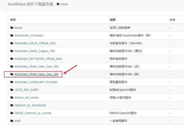 2.固件列表中還有許多其他固件,如openwrt、wrt等等,我們選擇梅林改版固件386: