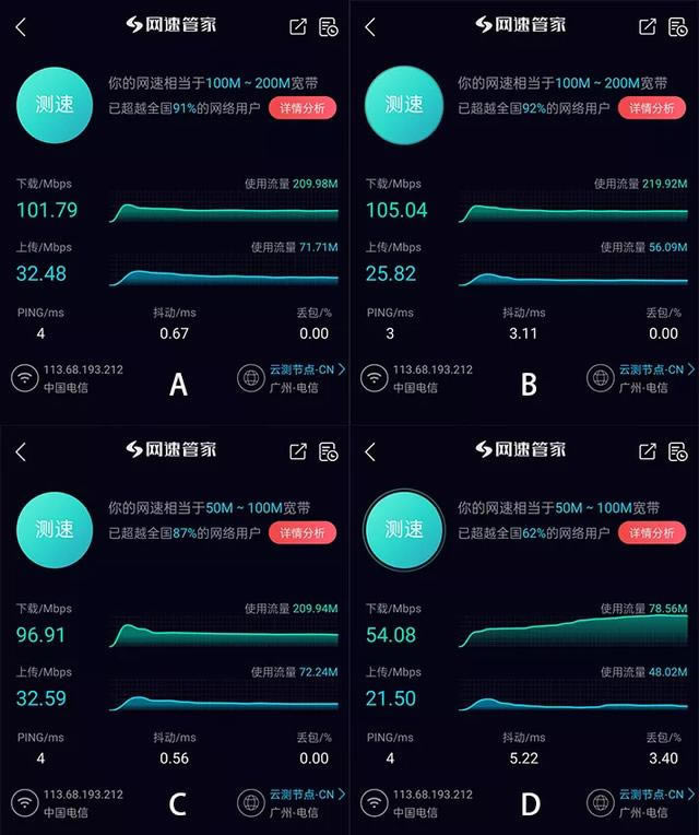 首先看網(wǎng)速,最高限制路由器 100Mbs 左右?guī)挼那闆r下,在 ABC 點幾乎可以滿,下載速度保持在 25-30Mbps 上下。 不過在 D 點的下載速率只有 50Mbps 上下,網(wǎng)絡抖動和丟包也大幅增加。