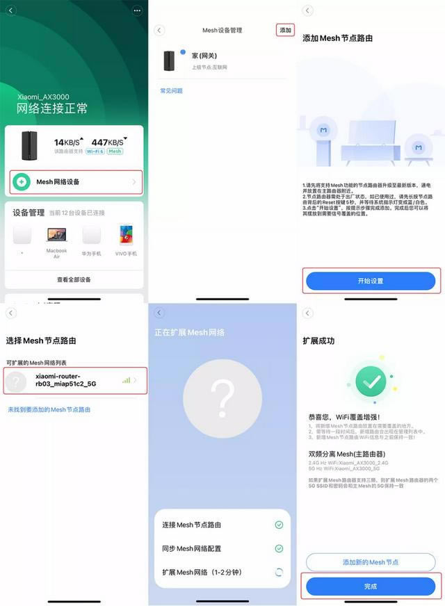 組成 Mesh 操作非常簡單,只需要在米家或小米 Wi-Fi 打開路由器相關頁面進入手機應用 Mesh 網(wǎng)絡設備,選擇設備,等待。