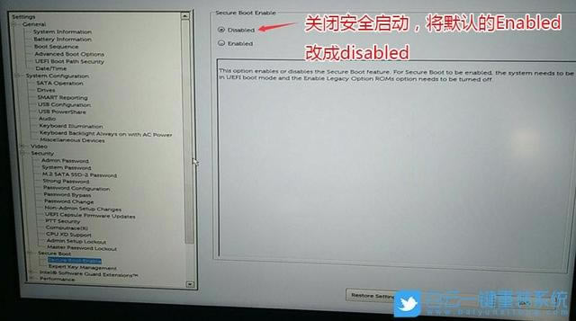 1.啟動或重啟戴爾電腦,即戴爾出現(xiàn)Logo連續(xù)按壓F2進(jìn)入BIOS,切換到Secure Boot,將Secure Boot Enable項改為Disabled,關(guān)閉安全啟動;