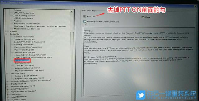 3.按鍵盤方向鍵,切換到Sercurity,移動到PTT Sercurity選項,并取消檢查右側(cè)PTT ON;  注:切換到System Configuration如果硬盤模式是,項RAID,那就將SATA Operatior改為硬盤模式AHCI否則,一些U盤會進(jìn)入模式PE找不到硬盤后,改變后,選擇退出并保存BIOS即可;