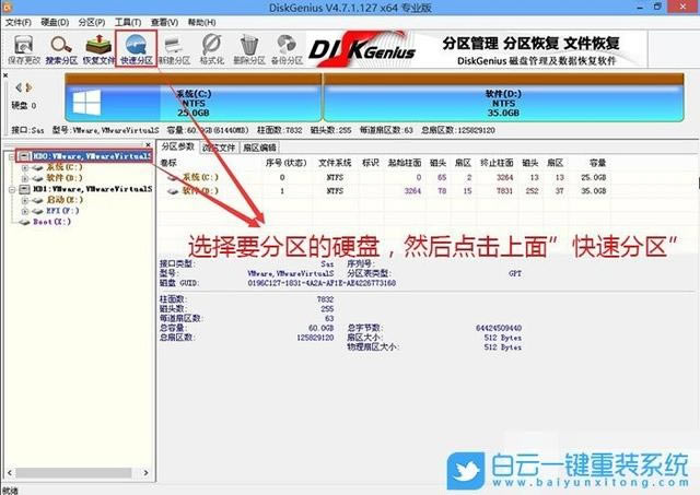2、DiskGenius分區(qū)工具菜單欄,選擇分區(qū)磁盤,然后點擊上述快速分區(qū);