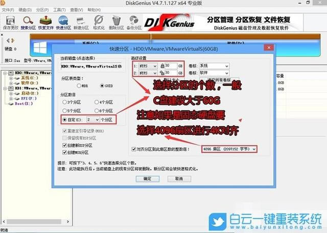 3.在快速分區(qū)窗口中選擇GUID分區(qū)表的類型,然后選擇分區(qū)的數(shù)量(可以根據(jù)實際情況劃分多少個分區(qū)),檢查創(chuàng)建新的ESP分區(qū)和創(chuàng)建MSR分區(qū),然后設(shè)置磁盤空間大小,推薦C盤大小超過600G比較好,最后如果是SSD對于固態(tài)硬盤,應(yīng)選擇4096扇區(qū)進(jìn)行4096扇K對齊; 4.分區(qū)完成后,可以看到ESP和MSR分區(qū)已經(jīng)完成,這意味著EFI建立了系統(tǒng)引導(dǎo)分區(qū),可安裝系統(tǒng);