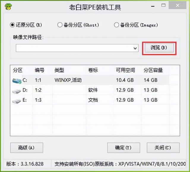 然后重啟計算機,出現啟動畫面時,用啟動快捷鍵引導u盤啟動到老白菜主菜單界面,選擇02老白菜Win8PE標準版(新機器)”回車確認。如下圖所示 ![]() 登錄舊白菜裝機版pe系統桌面會自動彈出老白菜PE點擊瀏覽裝機工具窗口(B)進入下一步。如下圖所示 ![]()