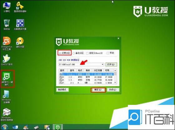 4、進(jìn)入PE系統(tǒng)完成后,備份C盤數(shù)據(jù),然后打開桌面PE根據(jù)圖中的實例設(shè)置安裝軟件,選擇安裝C盤,點擊確定按鈕;