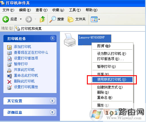 2、鼠標右擊打印機圖標,選擇“使用聯機打印機”。