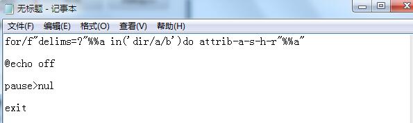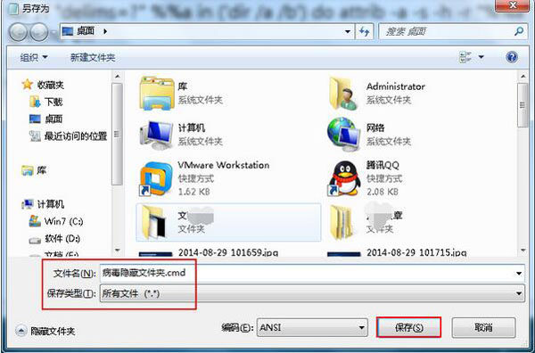 ![]() for/f"delims=?"%%a in('dir/a/b')do attrib-a-s-h-r"%%a" @echo off pause>nul exit 3、接著將這個記事本另存為“病毒隱藏文件夾.cmd”,保存類型為所有文件,點擊保存按鈕,如圖: