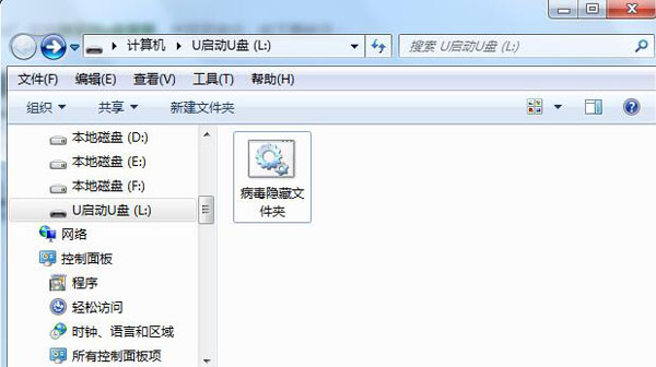 ![]() 4、然后將桌面上的“病毒隱藏文件夾.cmd”文件拷貝到u盤中,并且雙擊打開它,如圖: