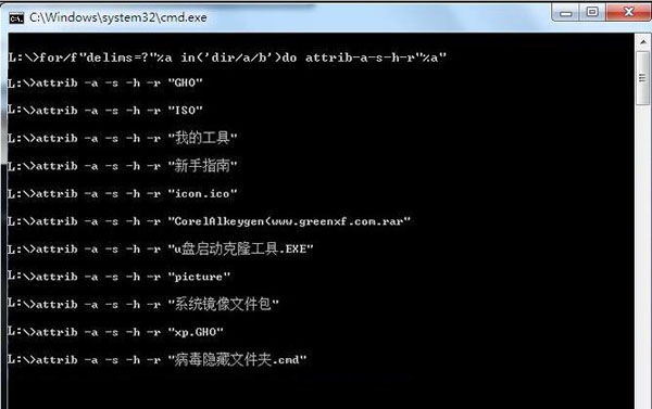 ![]() 5、打開cmd文件后,程序會對u盤執行attrib命令操作,這樣所有被病毒隱藏的文件夾就恢復了。如圖: