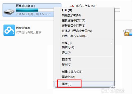 2、當電腦能夠正常識別U盤時,我們可以對U盤進行一次嘗試修復操作。右擊U盤盤符,從彈出的菜單中選擇“屬性”。