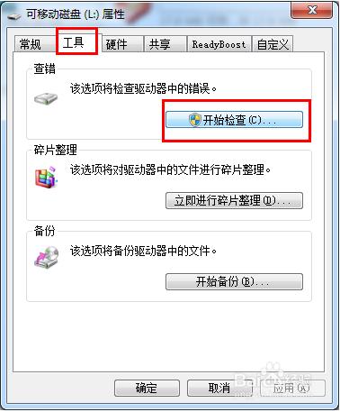3、接著在打開的“屬性”窗口中,切換至“工具”選項卡,點擊“查錯 開始檢查”按鈕。