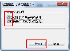 4、在彈出的窗口中,勾選 兩項,并點擊“開始”按鈕來嘗試修復U盤寫保護錯誤。