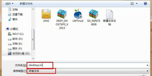 4、接著我們把里面的文件名改為desktop.ini,擴展名記得要是“ini”的文件,然后保存下。按下F5刷新即可;如果擔心在使用的時候不小心把這個文件和圖片刪除掉的話那么我們可以右擊屬性選擇隱藏。